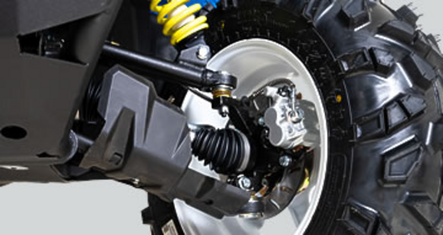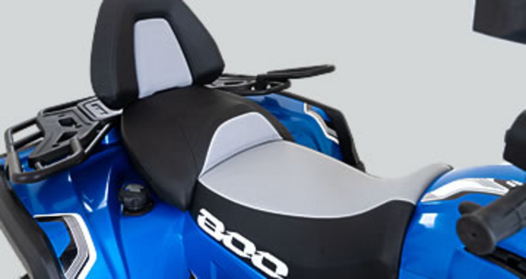 Двухместное сиденье с комфортной посадкой и независимая подвеска с ходом 250 мм обеспечивают плавность движения и поглощение неровностей. Полный привод с возможностью блокировки дифференциала, надёжный канадский вариатор CVTech и клиренс более 310 мм позволяют уверенно преодолевать любые препятствия.