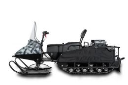 Мини-снегоход БУРЛАК-М Егерь — лёгкий и мощный транспорт, предназначенный для комфортного передвижения по заснеженной местности. Он станет надёжным спутником в зимних путешествиях, охоте или рыбалке, обеспечивая необходимую тягу и манёвренность. Сердцем снегохода служит бензиновый двигатель мощностью 15 л.с. с воздушным охлаждением и карбюраторной системой подачи топлива. Также доступны модификации с двигателями LIFAN 192F-2D до 20 л.с., что делает модель универсальной в различных условиях эксплуатации. Электростартер упрощает запуск в любых погодных условиях, а встроенная катушка на 7А позволяет подключать электрооборудование до 90 Вт. Благодаря этому снегоход можно дооснастить освещением, навигацией и другими полезными устройствами. Конструкция снегохода продумана до мелочей. Вместительный багажный отсек расположен там, где обычно размещён двигатель. Дополнительные отсеки под сиденьем и над мотором дают возможность перевозить снаряжение без саней — это экономит время и упрощает транспортировку. При весе всего 58 кг снегоход остаётся устойчивым и надёжным, способен развивать скорость до 40 км/ч и буксировать грузы до 150 кг. Его катковая подвеска и широкая гусеница (500 мм) обеспечивают отличную проходимость даже по глубокому снегу. БУРЛАК-М Егерь — это компактный, практичный и мощный мини-снегоход, созданный для тех, кто ценит автономность, надёжность и удобство. Вес всего 58 кг — легко транспортировать, просто управлять, высокая манёвренность. Несколько отсеков под груз: спереди, под сиденьем и над двигателем. Быстрый и удобный запуск в любых условиях — зимой и в межсезонье. Обеспечивает устойчивость и мягкий ход на неровной снежной поверхности. Все характеристики приведены для ознакомления и могут отличаться в зависимости от комплектации. Производитель оставляет за собой право изменять параметры без предварительного уведомления.БУРЛАК-М Егерь 15 л.с