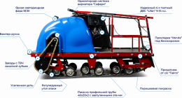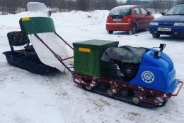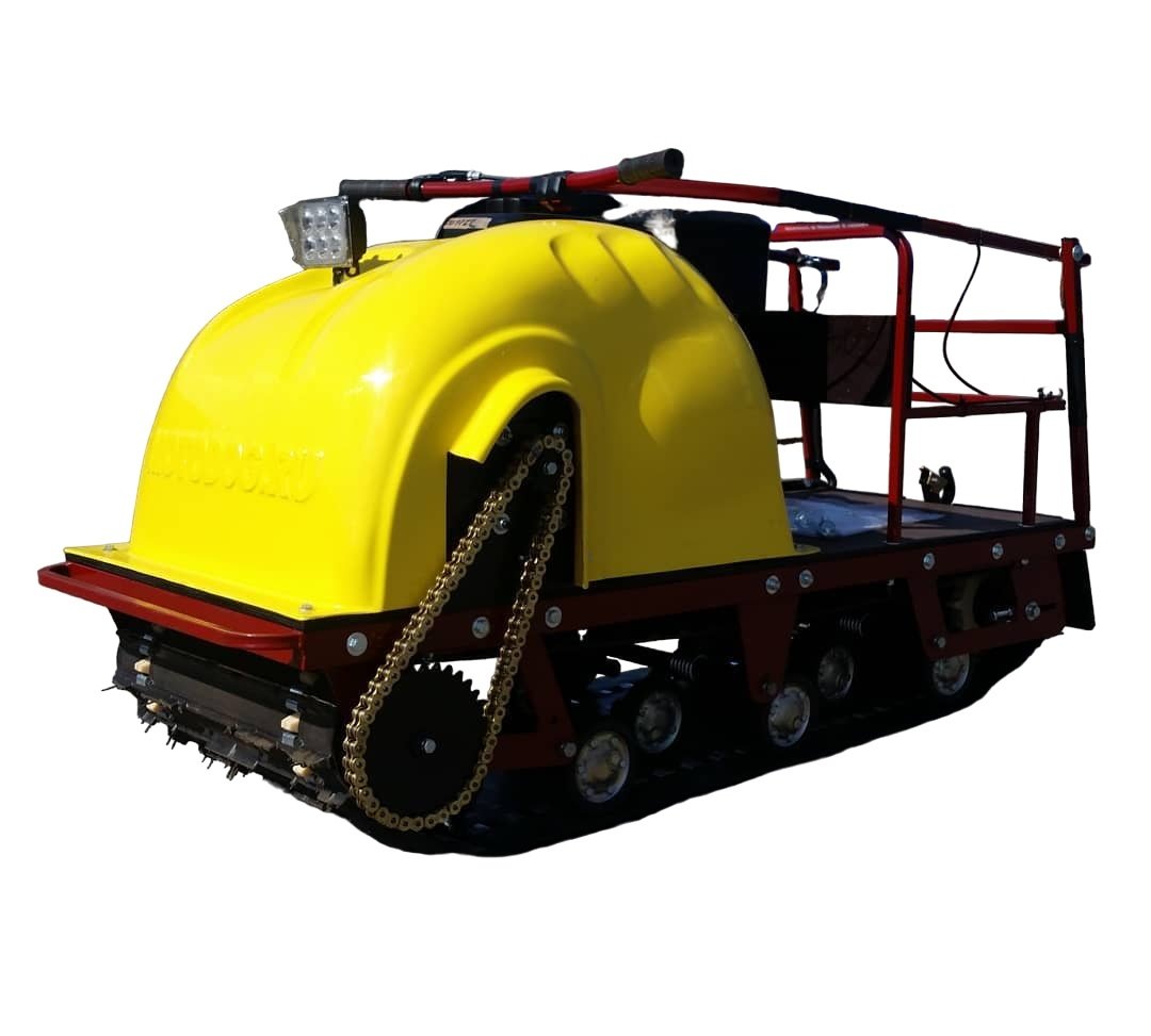 Конструкция включает устойчивую раму, рулевое управление, катково-склизовую подвеску и гусеницу шириной 500 мм с металлическими грунтозацепами, что обеспечивает отличное сцепление и мягкость хода. Подогрев ручек и наличие фары делают мотобуксировщик удобным и безопасным даже при эксплуатации в холодное и тёмное время суток.