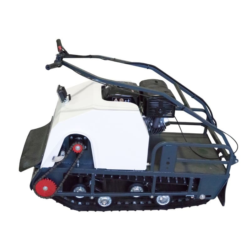 Компактные размеры, цельная гусеница шириной 500 мм и катковая подвеска обеспечивают отличную проходимость по рыхлому снегу, грунту и даже льду. Воздушное охлаждение и ручной стартер позволяют уверенно использовать мотобукс в любое время года. Модель укомплектована фарой и подогревом ручек для комфорта при эксплуатации зимой.