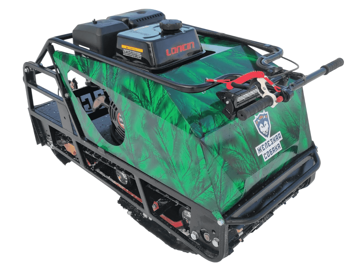 Широкая гусеница 500 мм и катковая подвеска позволяют уверенно передвигаться по снегу, льду и грунту. Цинковое антикоррозийное покрытие и порошковая краска увеличивают срок службы конструкции даже при жёсткой эксплуатации. Модель снабжена фарой и подогревом ручек, что обеспечивает комфорт и безопасность в любое время года.