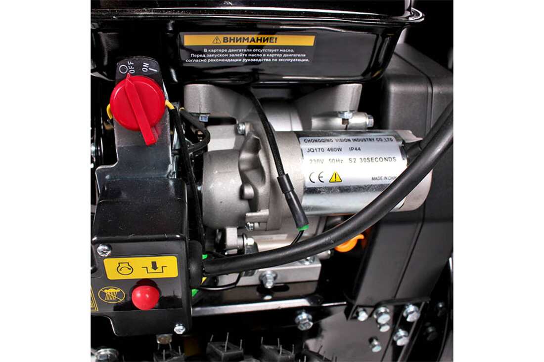 Электростартер. Напряжение до 220В, оснащает снегоуборщик быстрым запуском в любую погоду.