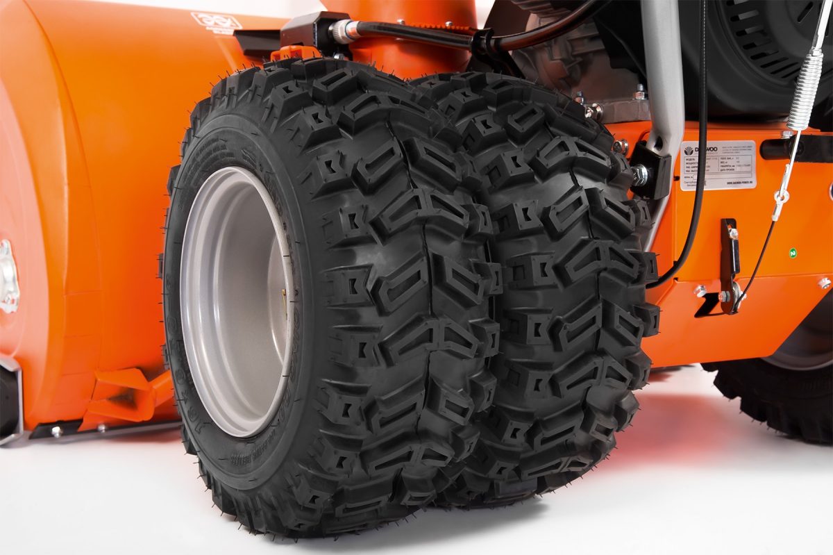 - Колеса X-Track. Снегоуборщик оснащен специальными колесами, которые имеют отличное сцепление с поверхностью и способны проходить по наклону и по скользкой дороге. Такие колеса обеспечивают движение на обледенелых поверхностях.