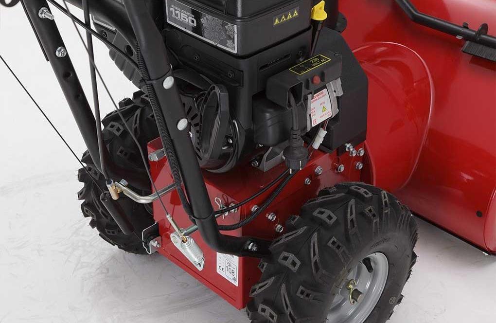 - Колеса с агрессивным протектором. Снегоуборщик оснащен шинами X-Trac 41х13 см, которые имеют отличное сцепление с поверхностью и могут проходить не только по наклону, но и по скользкой дороге. Такие колеса обеспечивают движение без пробуксовки даже на обледенелых поверхностях.