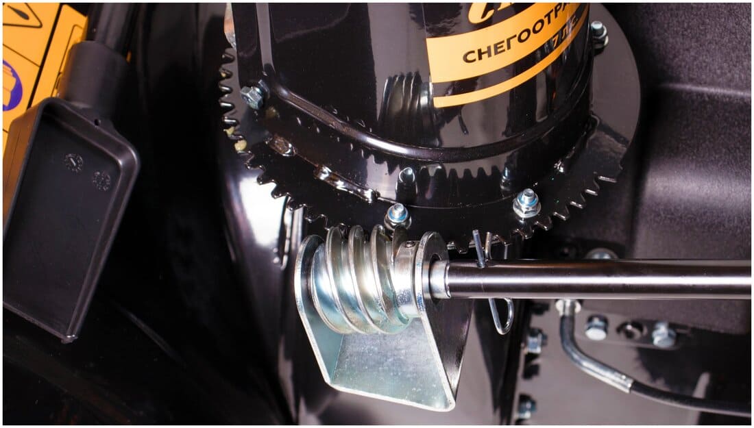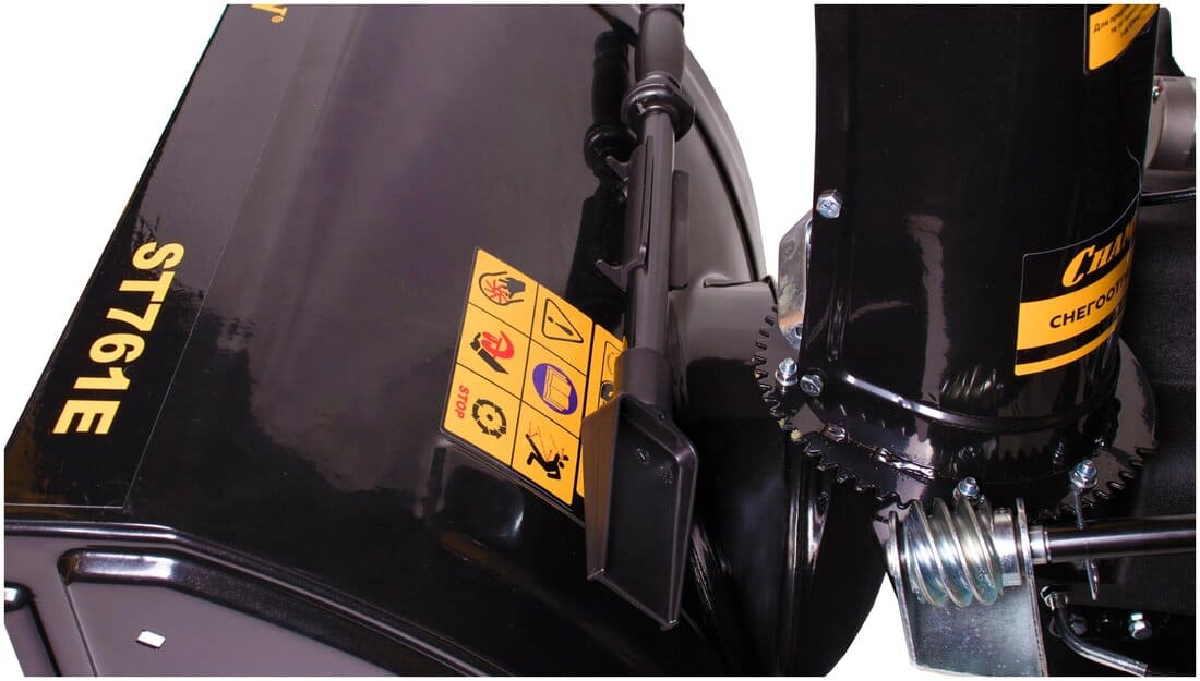 Дефлектор. Изготовлен из металла - это рукоятка, которая находится на корпусе в удобном месте и позволяет перенаправлять выброс снега до 190 градусов.